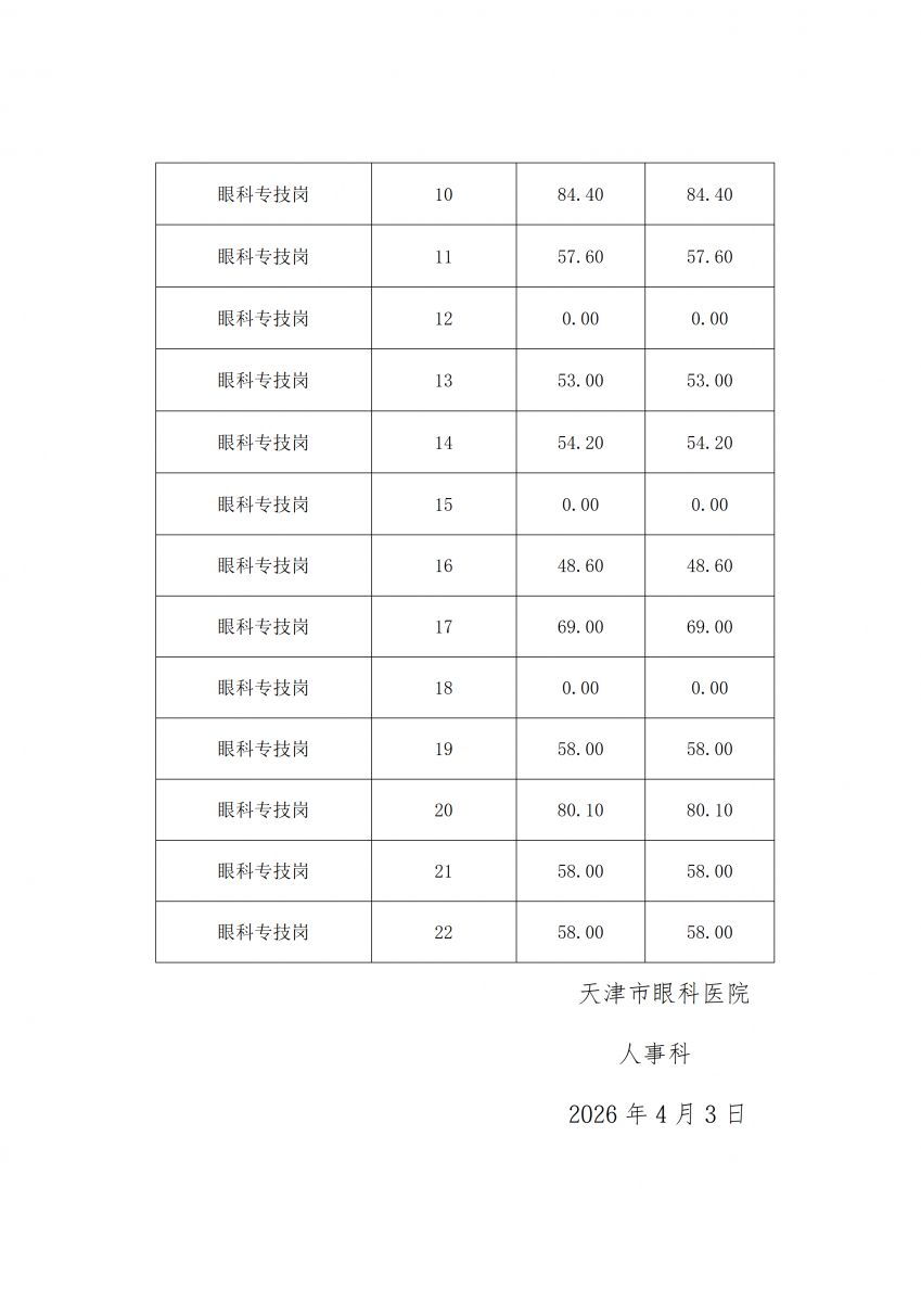 首页>>天津市卫生健康委所属天津市眼科医院2026年度公开招聘考核成绩公示