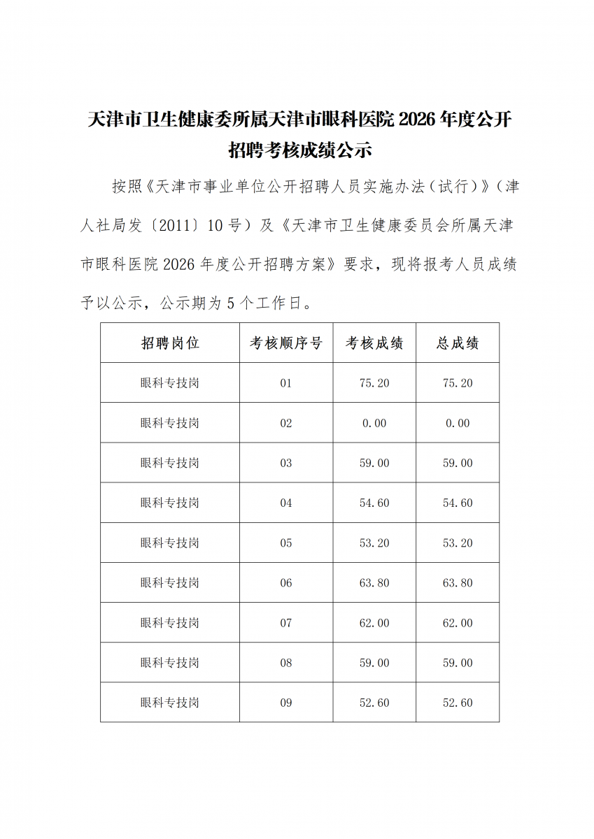 天津市卫生健康委所属天津市眼科医院2026年度公开招聘考核成绩公示