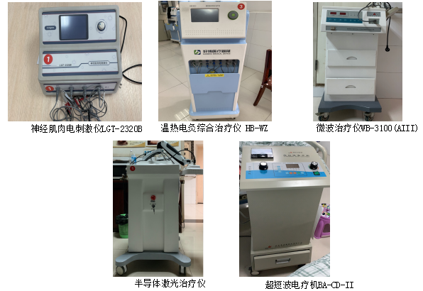 目前开展的传统中医诊疗技术:电针、浮针、刃针、揿针、穴位埋线、灸法、罐法、牵引、中药热奄包、中药熏洗、中药塌渍等;现代医学技术中频治疗仪、低频治疗仪、温热电灸仪、BLT高能量半导体激光治疗仪、多功能艾灸治疗仪等